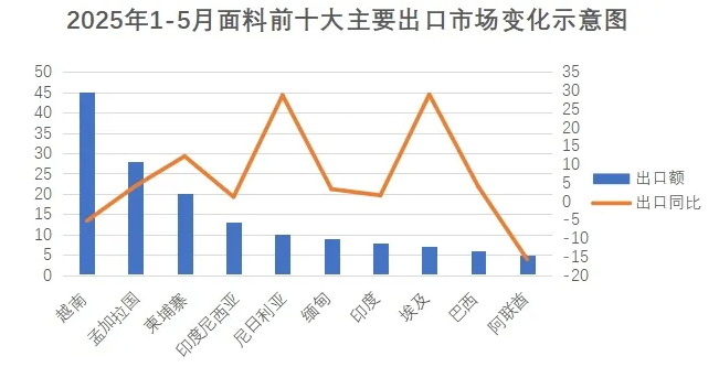 亚洲是我国面料出口的主要市场,2025年1-5月我国对亚洲国家累计出口面料190.9亿美元,占面料出口总额的67.3%。在前十大目标市场出口中,亚洲市场占了6席。越南作为我面料出口最大的单一市场,占我面料对全球出口的23.7%,出口额45.3亿美元,同比下降5.3%。
